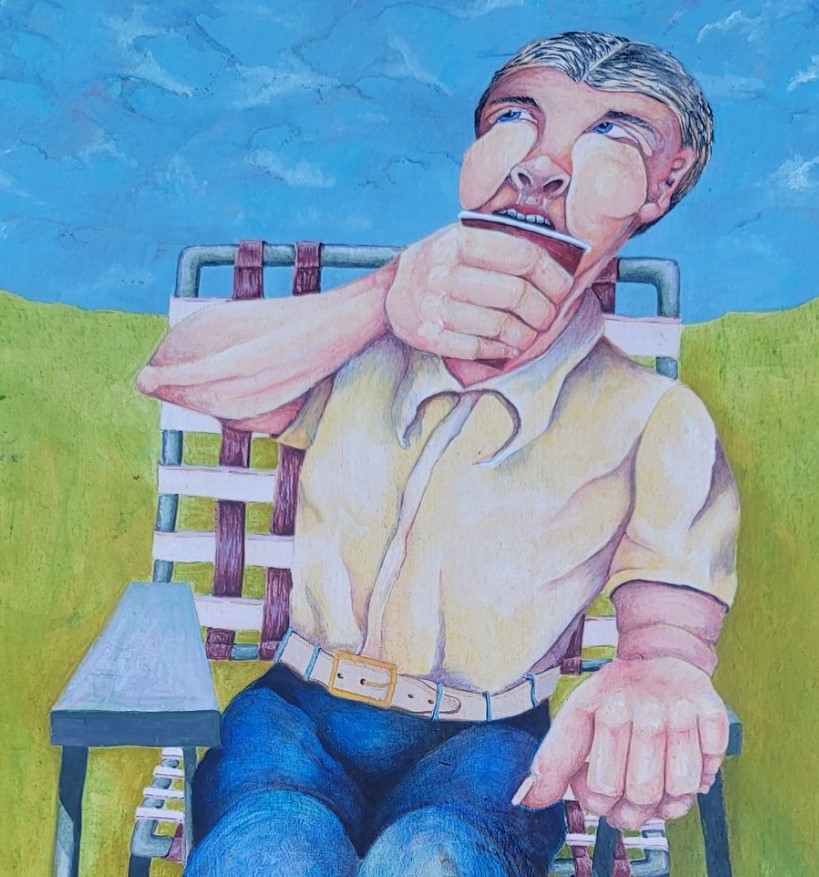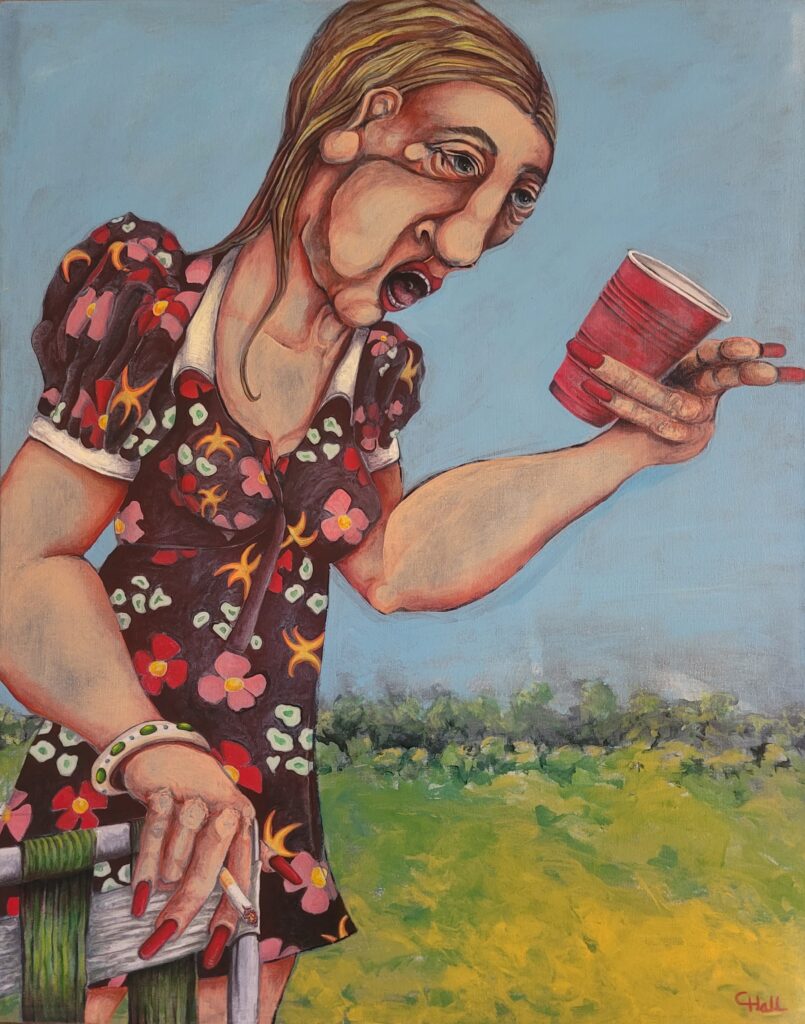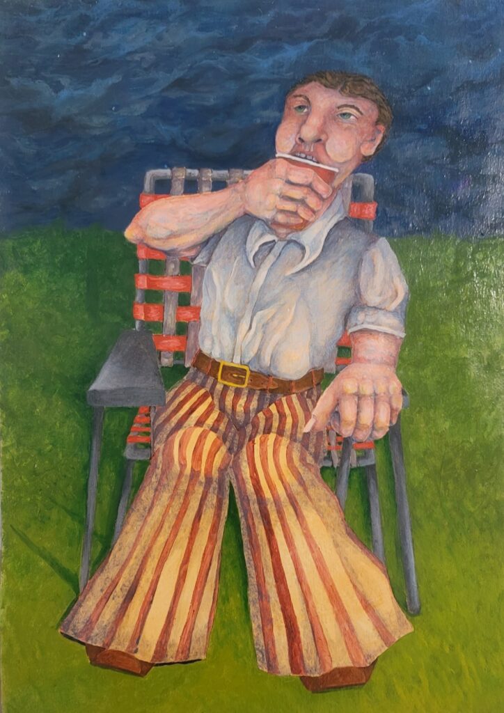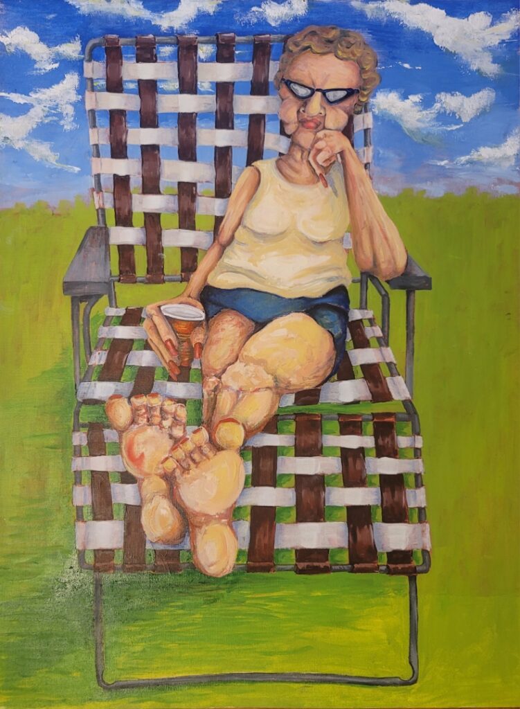 This series originated while I was looking at old family photos. I have a large extended family (an understatement) and there was never enough seating. To this day, I’m not sure how we all fit at my Grandma’s house for Christmas. But those were the best times–family, every form of Jell-o & side dish available, and always a laugh (or something memorable). Webbed lawn chairs were constant witnesses to our family gatherings, as I suspect they were to most other families in the 1970’s & 1980’s. Thus, the lawn chair series, each a witness to its occupant and a real or maybe not-so-real memory, event, character of my childhood. Narrative, yes; personal, yes; a bit kitschy, yes; but fun and I fall in love with each one as they evolve, weird traits and all — just like family!